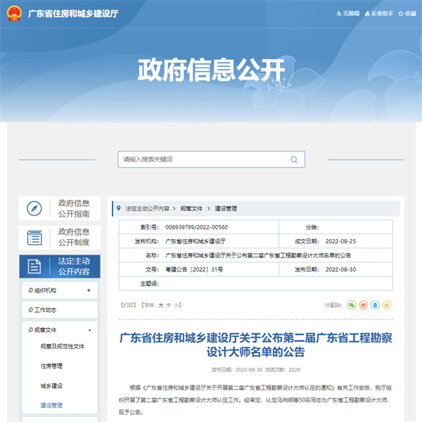 2022年8月30日,廣東省住房和城鄉(xiāng)建設廳網(wǎng)站發(fā)布第二屆廣東省工程勘察設計大師評選結果,公司總工程師徐波、首席專家靳守杰、特聘專家王建新榜上有名,獲評廣東省工程勘察設計大師。同時獲評3位廣東省工程勘察設計大師,體現(xiàn)了公司在尖端科技人才培養(yǎng)、專家團隊建設的發(fā)展優(yōu)勢,標志著公司在人才工程建設方面取得了階段性勝利,為企業(yè)技術創(chuàng)新、成果轉化、人才培養(yǎng)等方面提供了更廣闊的發(fā)展空間。