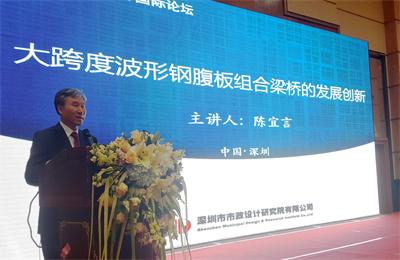 陳宜言董事長(zhǎng)在大會(huì)上做了題為《大跨度波形鋼腹板組合梁橋的發(fā)展創(chuàng)新》的主題演講。他首先介紹了中國(guó)橋梁建設(shè)已由橋梁大國(guó)向強(qiáng)國(guó)發(fā)展中所取得的成就,梳理了中國(guó)橋梁發(fā)展的脈絡(luò),還介紹了大跨度波形鋼腹板組合橋這一新型組合橋梁的特點(diǎn)和發(fā)展歷史,并詳細(xì)介紹我司對(duì)該類橋梁的設(shè)計(jì)和創(chuàng)新工作。他還指出,深圳市東寶河新安特大橋的結(jié)構(gòu)創(chuàng)新設(shè)計(jì),證明了我國(guó)大跨度波形鋼腹板組合箱梁橋的跨徑已經(jīng)取得巨大突破,當(dāng)前的設(shè)計(jì)和施工技術(shù)水平可以使該橋梁的主跨達(dá)到200m。伊朗德黑蘭北部高速BR-06特大橋的成功合龍,體現(xiàn)了大跨度波形鋼腹板組合箱梁橋在強(qiáng)地震烈度地區(qū)的推廣和使用價(jià)值。而在建中的合肥市南淝河特大橋,進(jìn)一步說明了波形鋼腹板組合箱梁橋可以滿足超寬城市橋梁的設(shè)計(jì)要求。該橋也是我國(guó)首次將耐候鋼大規(guī)模使用到大跨度波形鋼腹板組合箱梁橋上,為我國(guó)鋼混組合結(jié)構(gòu)橋梁的防腐和養(yǎng)護(hù)提出了新的解決方案。他認(rèn)為“中國(guó)制造2025”概念的提出,為我國(guó)由橋梁大國(guó)轉(zhuǎn)變成橋梁強(qiáng)國(guó)帶來(lái)了最佳契機(jī)。雖然我國(guó)橋梁工程設(shè)計(jì)、施工和科研方面都取得了一定成果,但仍需要持續(xù)提升我國(guó)橋梁建設(shè)創(chuàng)新能力和技術(shù)競(jìng)爭(zhēng)力,尤其在結(jié)構(gòu)分析和設(shè)計(jì)軟件國(guó)產(chǎn)化方面需下大力氣。大跨度波形鋼腹板組合梁橋,比起預(yù)應(yīng)力混凝土梁橋具有顯著的社會(huì)和經(jīng)濟(jì)效益,將在建設(shè)橋梁強(qiáng)國(guó)的過程中發(fā)揮重要作用。近十年來(lái)陳宜言董事長(zhǎng)對(duì)推動(dòng)我國(guó)大跨度波形鋼腹板組合箱梁發(fā)展所做出的貢獻(xiàn),得到了與會(huì)專家學(xué)者的贊賞,他對(duì)中國(guó)橋梁工程發(fā)展創(chuàng)新的觀點(diǎn)也得到大家認(rèn)同。
