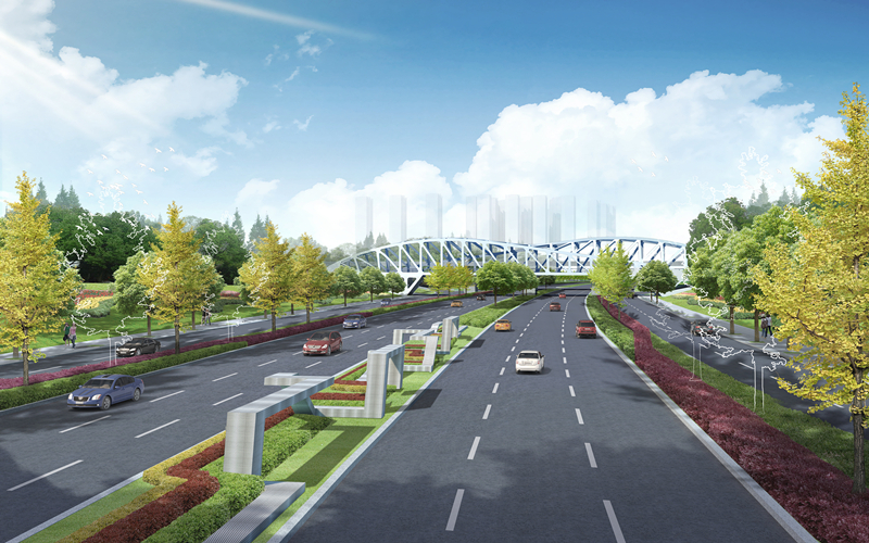 道路交通方案結(jié)合高新大道功能定位,區(qū)域發(fā)展需求,進(jìn)行全路段交通量預(yù)測,合理的確定道路及相交節(jié)點方案。大力倡導(dǎo)綠色交通、改善公交出行環(huán)境,引導(dǎo)城市居民優(yōu)先采用慢行和公交方式出行;充分利用智能交通手段、有序分配道路交通資源,解決交通擁堵現(xiàn)狀,改善交通秩序;并以巧妙的手法解決了高新大道快速化改造后對光谷中心城區(qū)的分割影響。