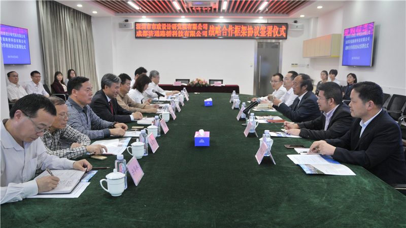 2017年4月24日下午,我公司與成都濟(jì)通路橋科技有限公司(以下簡(jiǎn)稱“濟(jì)通科技”)戰(zhàn)略合作框架簽署儀式在公司一樓技術(shù)交流中心舉行,董事長(zhǎng)陳宜言設(shè)計(jì)大師和濟(jì)通科技伍廷貴董事長(zhǎng)代表雙方簽字。蔡明總經(jīng)理、宋榮亮主席、郭明副書記、王建新副總經(jīng)理、張健君副總經(jīng)理、許華林副總經(jīng)理、徐波總工程師以及相關(guān)部門負(fù)責(zé)人和專業(yè)總工,濟(jì)通科技伍大成總經(jīng)理、趙鵬賢副總經(jīng)理,鄒貽軍技術(shù)總監(jiān)、技術(shù)部高建主任出席簽署儀式。儀式由我公司黨委副書記、紀(jì)委書記、工會(huì)主席郭明主持。