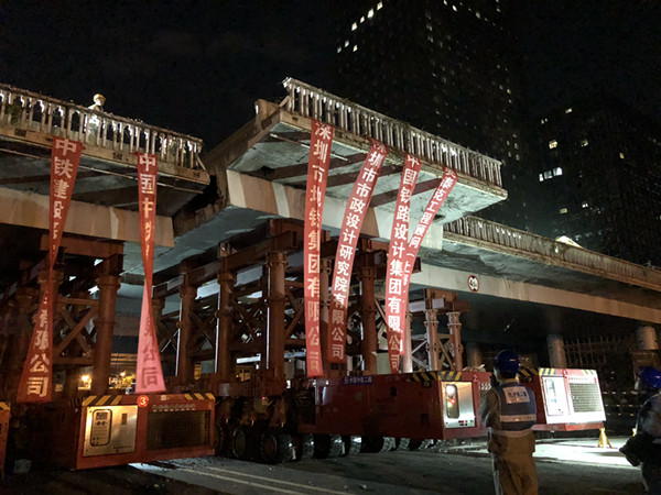 施工單位提前完成橋面設(shè)施拆除、鉆孔、設(shè)備安裝等準(zhǔn)備工作后,2017年12月29日晚11點(diǎn)開始拆橋工作,至2018年1月2日凌晨4點(diǎn)深南大道南北兩側(cè)交替封道4晚,彩田橋中間4跨連續(xù)梁采用SPMT模塊車順利拆除。拆除橋梁長(zhǎng)度約200m,共切割成22段梁體,單個(gè)梁體最大重量達(dá)300t,是目前國內(nèi)首座采用SPMT模塊車快速拆除的預(yù)應(yīng)力混凝土連續(xù)梁橋。全橋拆除時(shí)間與建設(shè)福田樞紐時(shí)60天拆除益田橋相比,時(shí)間僅為其1/6,我公司的技術(shù)創(chuàng)新充分證明了“深圳速度”,而且為橋梁工程的發(fā)展增添了寶貴經(jīng)驗(yàn)。