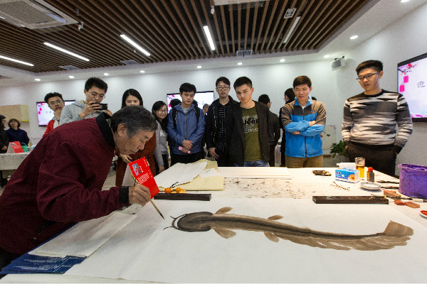 深漂藝術(shù)家魏治平老師在創(chuàng)作的間隙,為大家講述了書畫的精神內(nèi)涵以及在新時代下他對書畫的理解,生動地將“青春踐行十九大”、“幸福都是奮斗出來的”、“逢山開路遇水架橋”等文字融入自己的書畫創(chuàng)作中,令在場的青年員工受益匪淺。