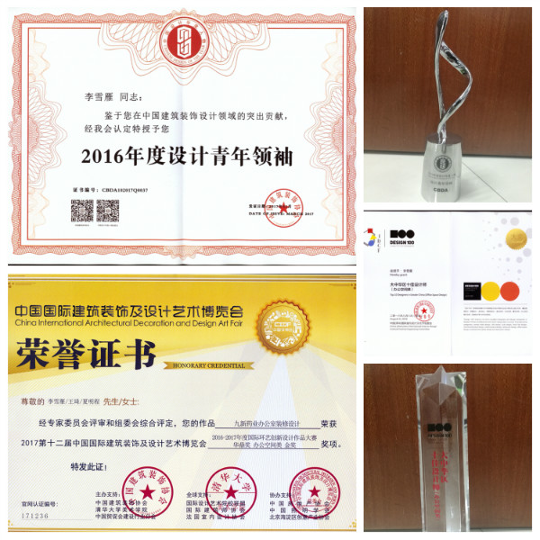 “中國建筑裝飾協(xié)會2016年度設(shè)計青年領(lǐng)袖”、“華鼎獎金獎”及“大中華區(qū)十佳設(shè)計師”獲獎證書和獎杯