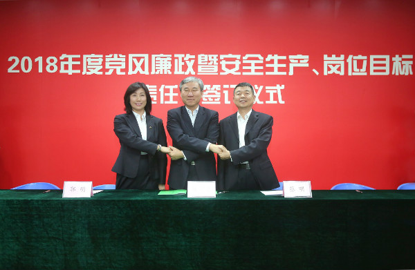 黨委書記、董事長(zhǎng)陳宜言與黨委副書記、總經(jīng)理蔡明和黨委副書記、紀(jì)委書記、工會(huì)主席郭明簽署責(zé)任書