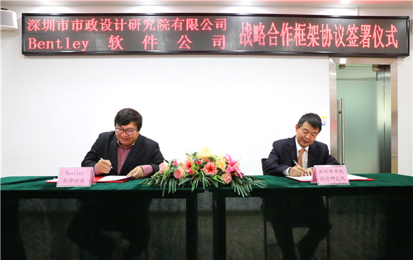 2018年4月24日上午,公司與BENTLEY軟件(北京)有限公司(以下簡稱“BENTLEY公司”)戰(zhàn)略合作框架協(xié)議簽署儀式在市政設(shè)計大廈一樓技術(shù)交流中心舉行。公司總經(jīng)理蔡明、副總經(jīng)理許華林以及相關(guān)部門負責人,BENTLEY公司北亞區(qū)總裁劉德盛、技術(shù)總監(jiān)李翔等領(lǐng)導與嘉賓參加了簽署儀式。公司總經(jīng)理蔡明與BENTLEY公司北亞區(qū)總裁劉德盛分別代表雙方在戰(zhàn)略合作框架協(xié)議上簽字。